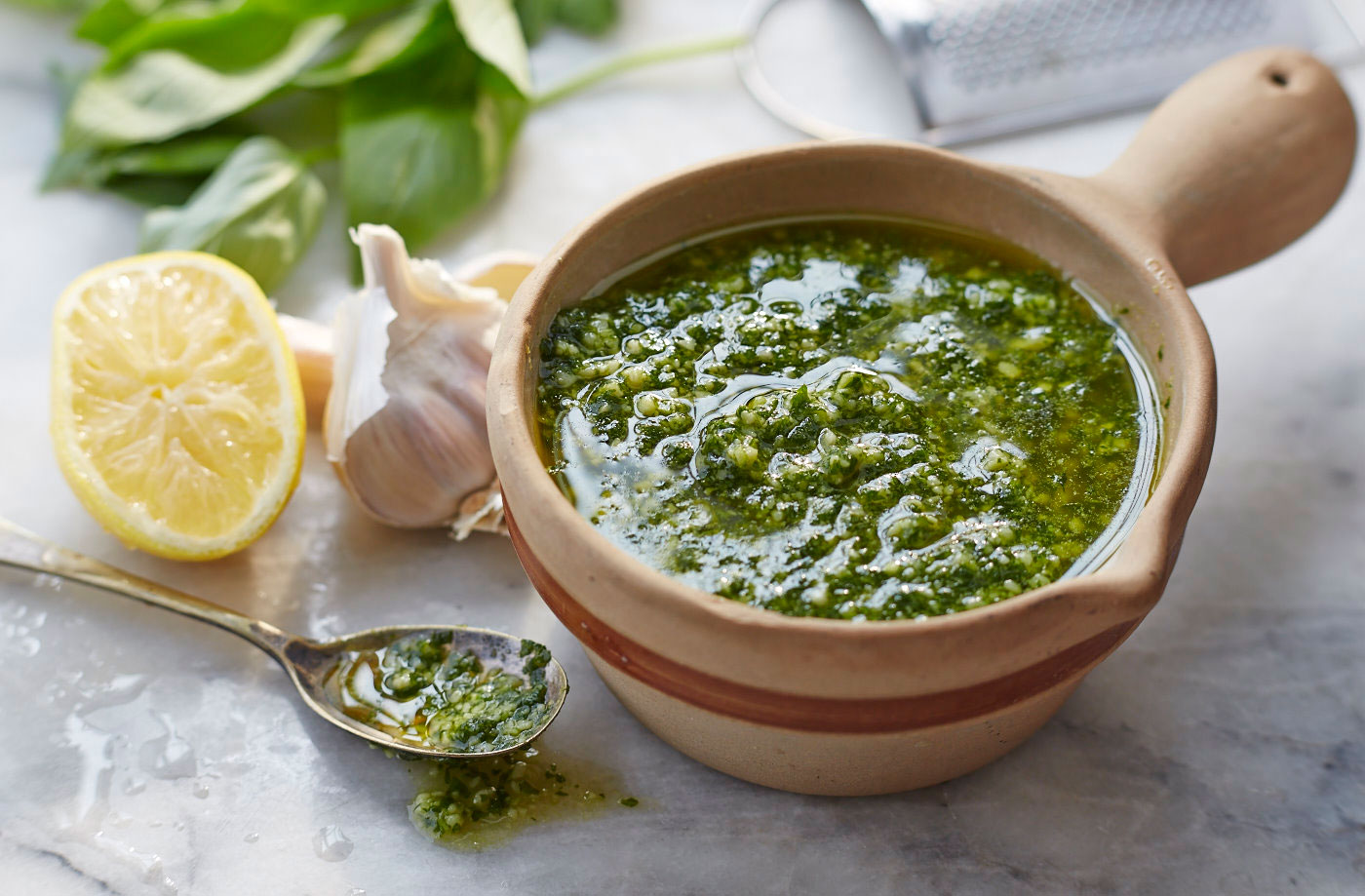 Faço um pesto diferente do tradicional, sem pinhole e queijo, para melhorar custo e valor nutricional.